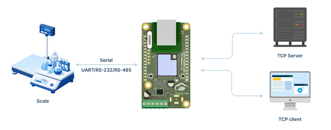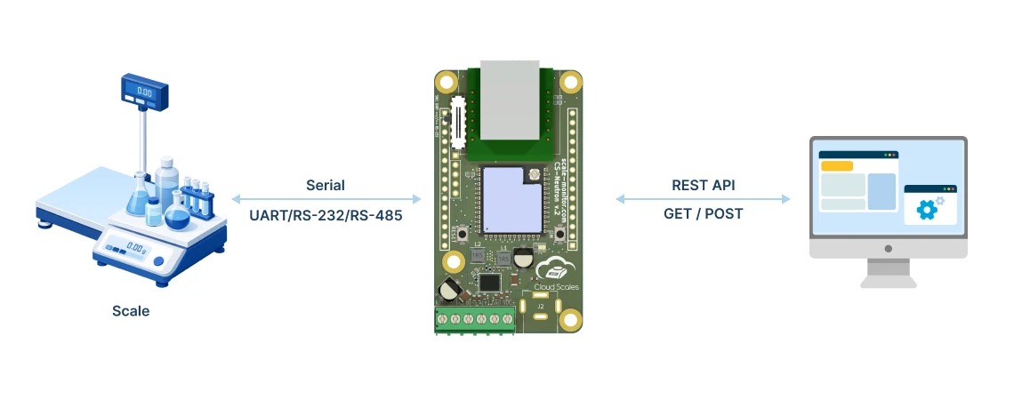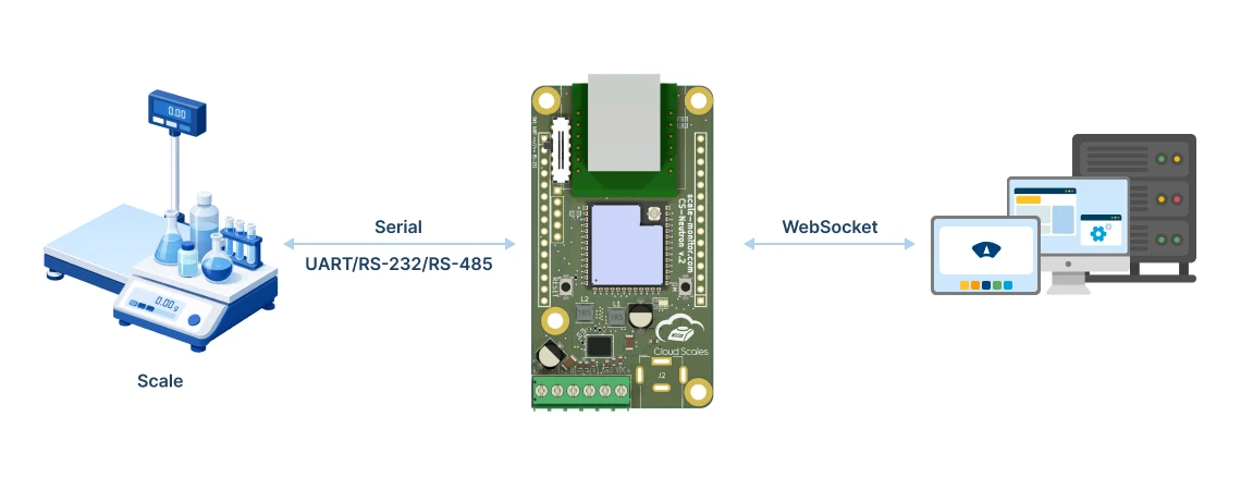 CSL Neutron connects scales via UART, RS-232, or RS-485 to modern cloud systems without modifying firmware or replacing hardware.