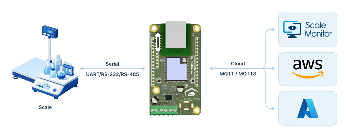 Neutron acts as a secure bridge between the serial side of a weighing device and the digital side of your infrastructure. On the device side, it connects through UART, RS-232, or RS-485. On the system side, it can communicate with cloud services, servers, and applications using modern network and API-based methods. Configuration can be done through web tools, Bluetooth BLE, or other CloudScaleLink utilities, making deployment fast in both OEM and retrofit scenarios.
