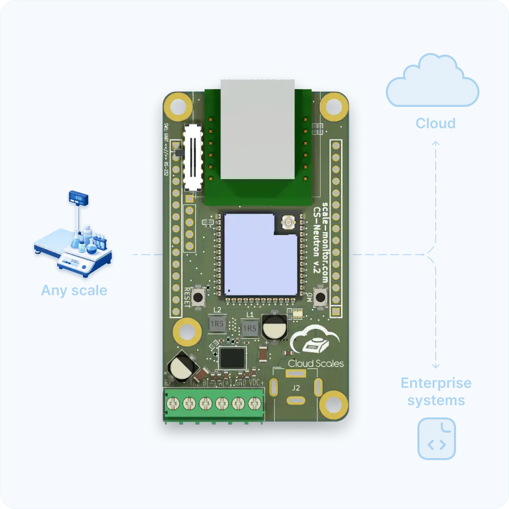 Neutron is a compact connectivity module that turns existing serial weighing devices into secure, connected systems — without changing the scale.